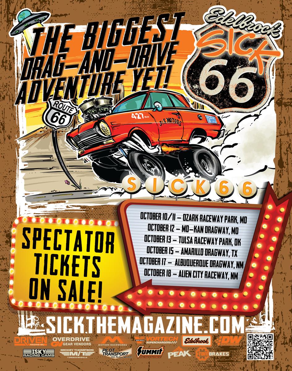 A 1300-mile, Route 66-inspired drag-and-drive event will roll into Tulsa Raceway Park on Sunday October 13, 2025 with the running of Edelbrock Sick 66.