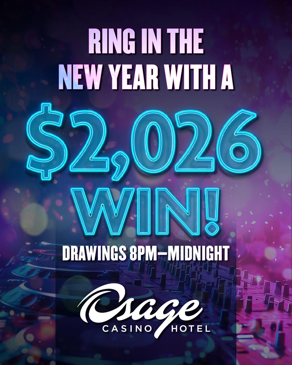Come to Osage Casino on New Year’s Eve and raise a glass to 2026—and it might get filled with $2,026 cash! Starting at 8 p.m., for every 10 points you earn playing slots or table games, you’ll get one entry for our hourly cash drawings of $2,026. Drawings will be held between 8 p.m. and midnight, with a total of 52 winners across all locations.