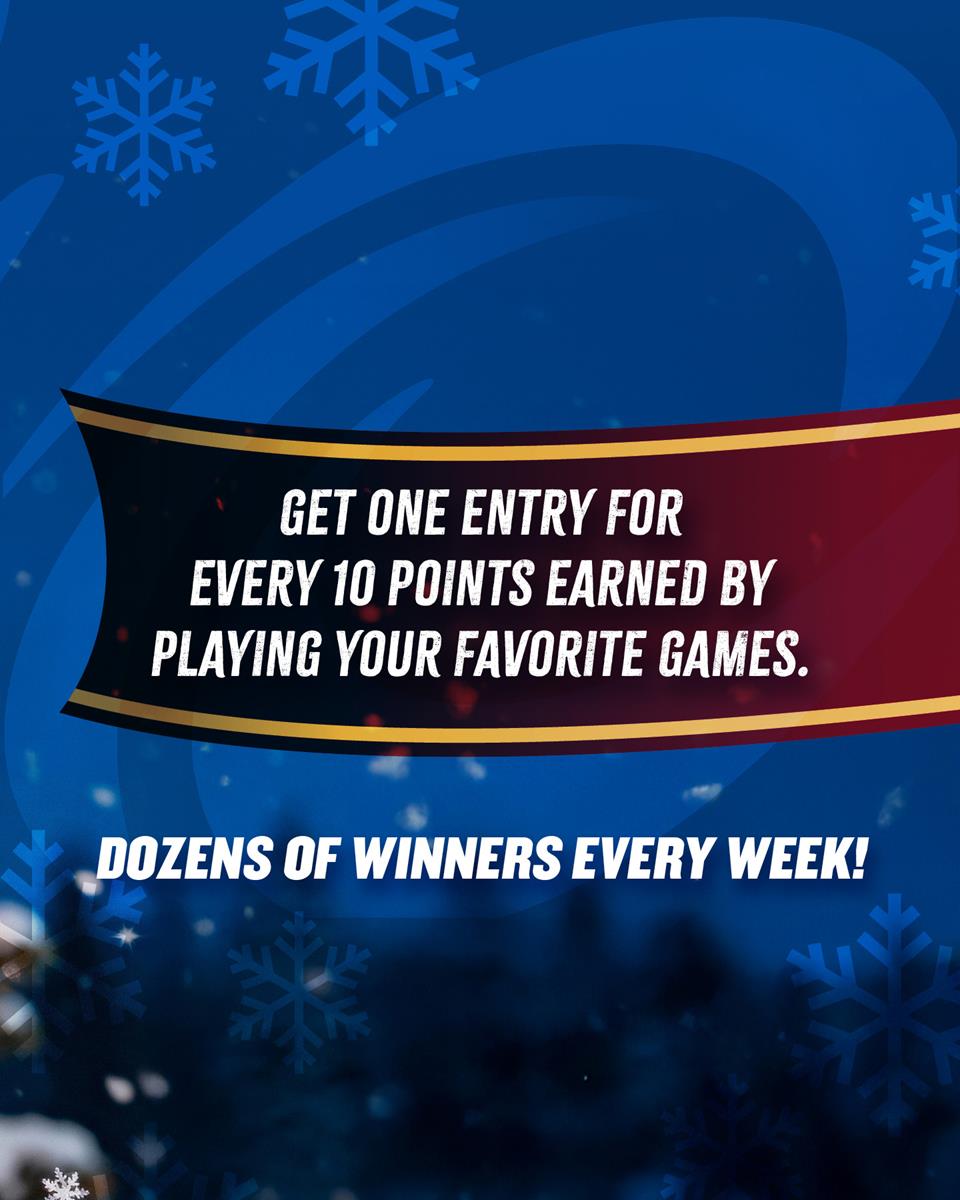 Nothing puts you in the holiday spirit like a thousand bucks in cold cash! Come play every Saturday in December between 12 a.m. and 10 p.m. For every 10 points you earn playing your favorite games, you’ll get one entry for our hourly $1,000 cash drawings.