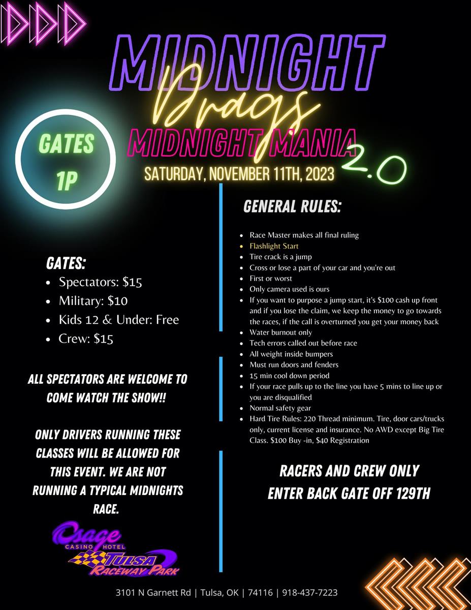 Come join us on Saturday November 11th for our 2nd installment of Midnight Mania! This event is a No Prep event. Racers from all over who street race in "Mexico" will be in attendance. John Wooley guarantees this event to be bigger than our first event in July! Our starting line will began on our track between the 2 main grandstands and end at the scoreboards. John will be on the starting line to offer up the flashlight starts. This is an action packed event that we cannot wait for! Gates open at 1p and racing starts at 2p. Racers and their crew need to enter off 129th (back gate) and spectators need to enter off Garnett (main entrance).